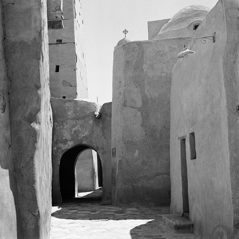 Drawing inspiration from Erwin Panofsky’s theory, particularly his concepts of iconography and iconology, Hafez’s work transcends mere representation to delve into the deeper meanings and cultural contexts embedded within these sacred spaces. Hafez’s work challenges these mediated representations by presenting the raw, contemplative essence of Coptic Monasticism in stark monochrome.